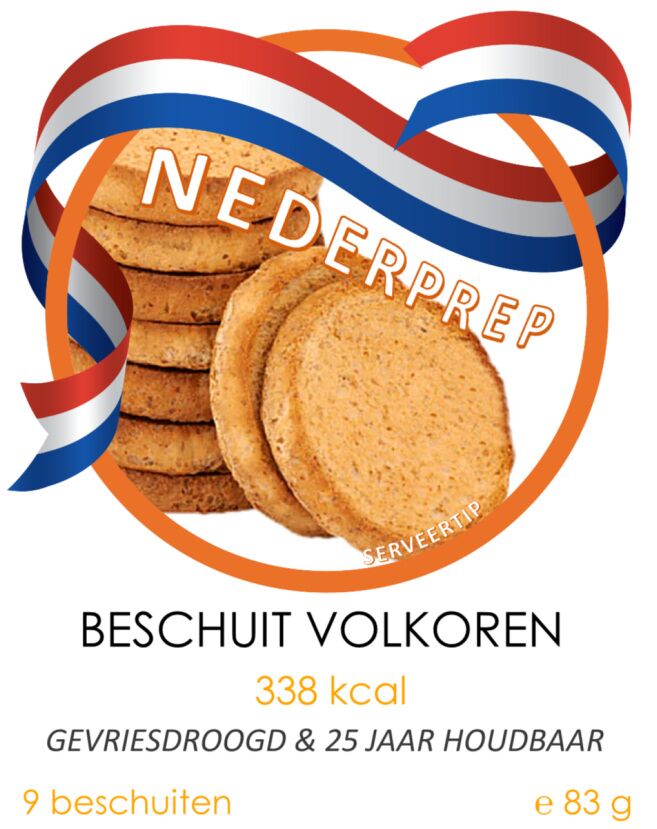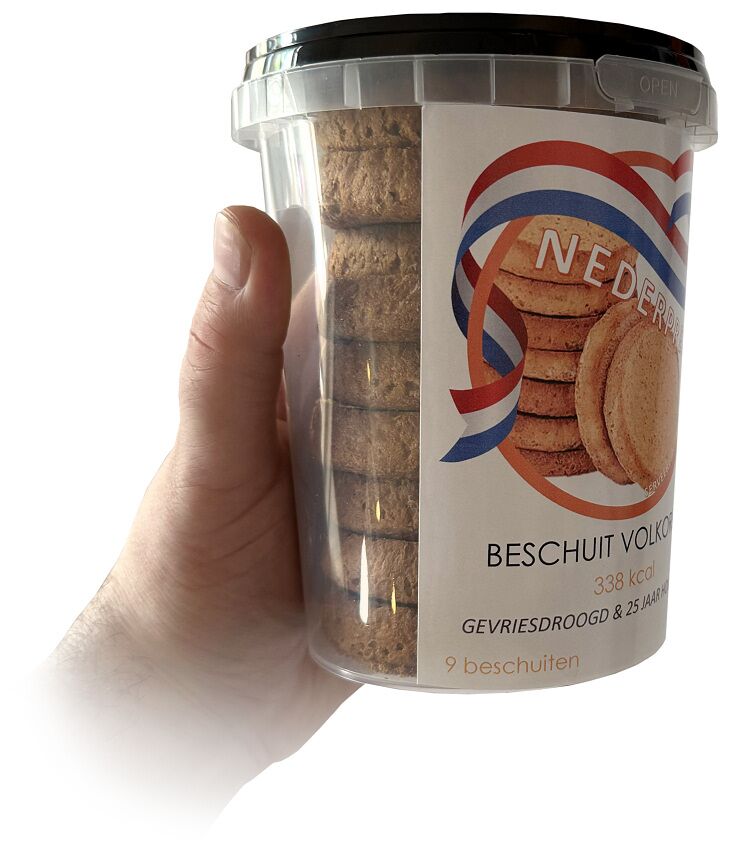 Deze gevriesdroogde beschuiten zijn maarliefst 25 jaar houdbaar. Heerlijk Nederlandse kwaliteit van ons huismerk NEDERPREP.