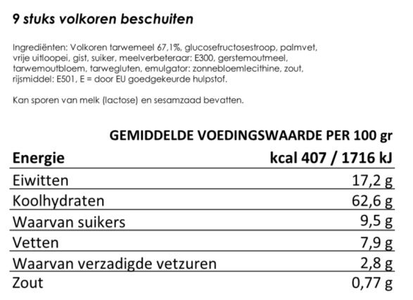 Allergenen: tarwe (gluten). soja , ei. Kan sporen van melk (lactose) en sesamzaad bevatten.