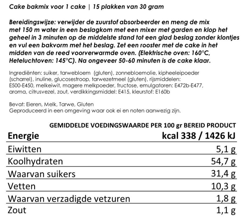 Bereidingswijze: verwijder de zuurstof absorbeerder en meng de mix met 150 ml water in een beslagkom met een mixer met garden en klop het geheel in 3 minuten op de middelste stand tot een glad beslag zonder klontjes en vul een bakvorm met het beslag. Zet een rooster met de cake in het midden van de reed voorverwarmde oven. (Elektrische oven: 160°C, Heteluchtoven: 145°C). Na ongeveer 50-60 minuten is de cake klaar.