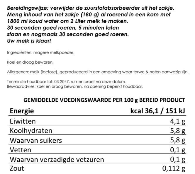 Bereidingswijze: verwijder de zuurstofabsorbeerder uit het zakje. Meng inhoud van het zakje (180 g) al roerend in een kom met 1800 ml koud water om 2 Liter melk te maken. 30 seconden goed roeren, 5 minuten laten staan en nogmaals 30 seconden goed roeren. Uw melk is klaar!
