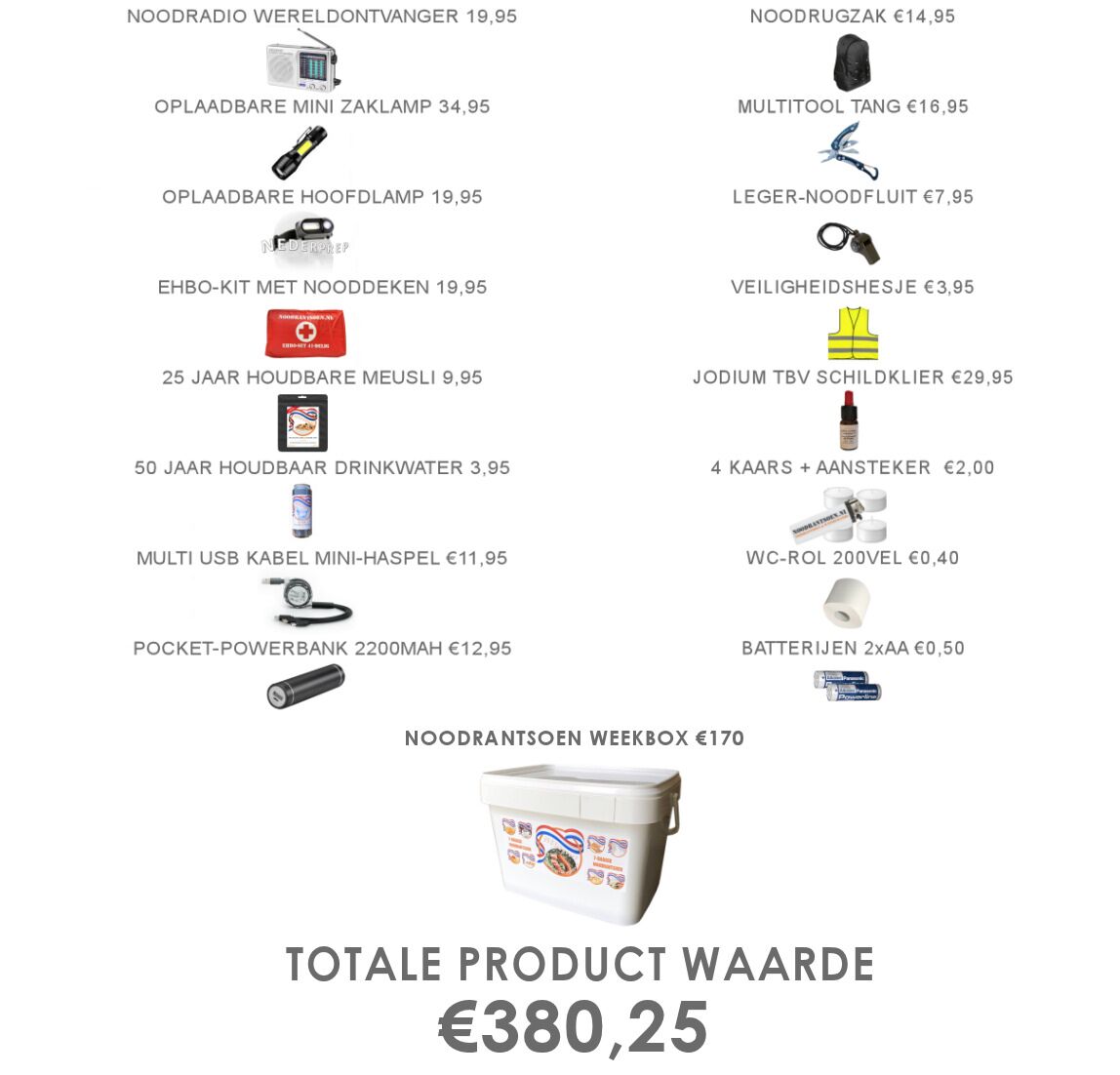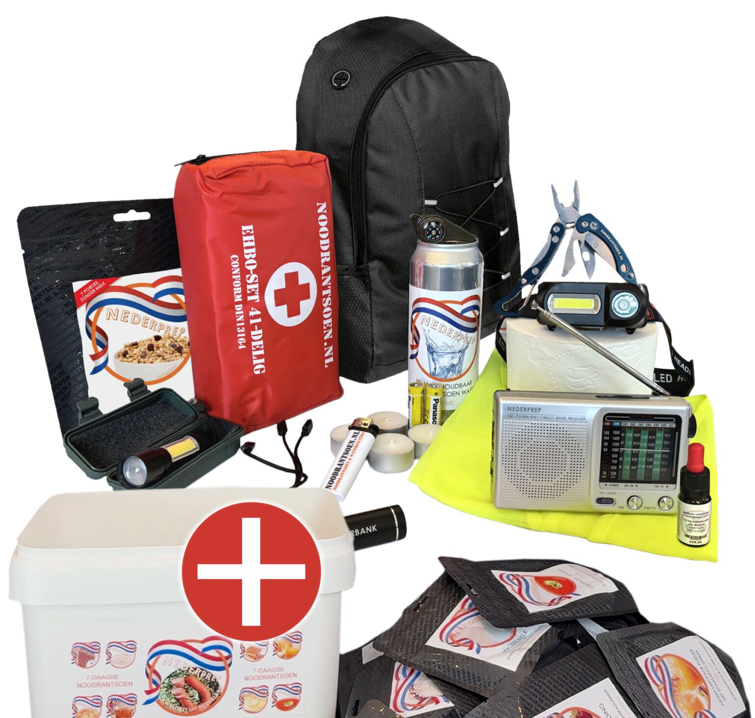- Onze 2 meest verkochte pakketten in 1 deal. Het noodpakket BASIS + onze 25 jaar houdbare noodrantsoen weekbox met 7 dagen lang 2.000 Kcal per dag Nederlands eten en drinken!