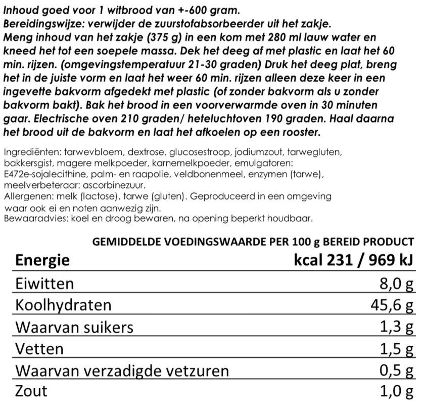 Ingrediënten: tarwebloem, dextrose, glucosestroop, jodiumzout, tarwegluten, bakkersgist, magere melkpoeder, karnemelkpoeder, emulgatoren: E472e-sojalecithine, palm- en raapolie, veldbonenmeel, enzymen (tarwe), meelverbeteraar: ascorbinezuur.