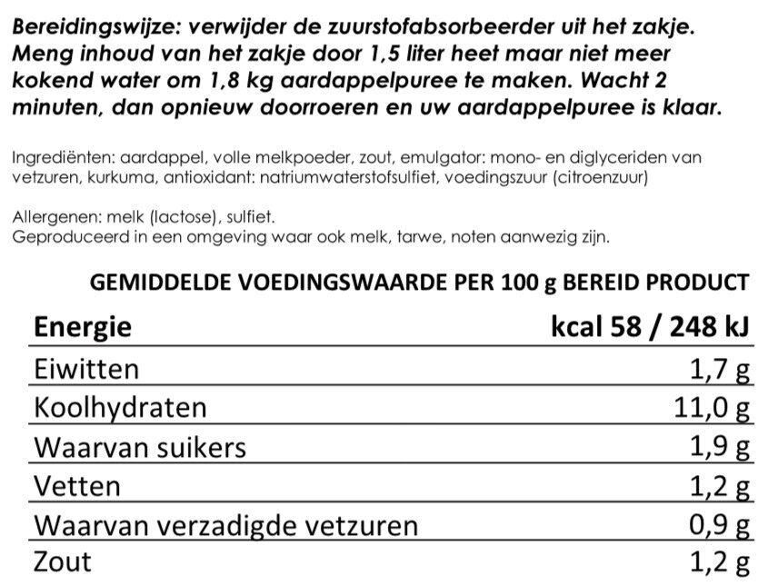 Bereidingswijze: verwijder de zuurstofabsorbeerder uit het zakje. Meng inhoud van het zakje door 1,5 liter heet maar niet meer kokend water om 1,8 kg aardappelpuree te maken. Wacht 2 minuten, dan opnieuw doorroeren en uw aardappelpuree is klaar.