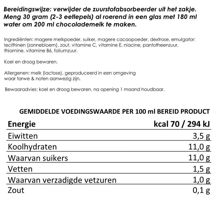 Ingrediënten: magere melkpoeder, suiker, magere cacaopoeder,