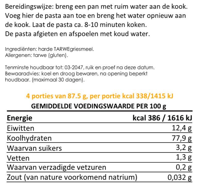 Bereidingswijze: breng een pan met ruim water (2 liter) aan de kook. Voeg hier de pasta aan toe en breng het water opnieuw aan de kook. Laat de pasta ca. 8-10 minuten koken. De pasta afgieten en afspoelen met koud water.