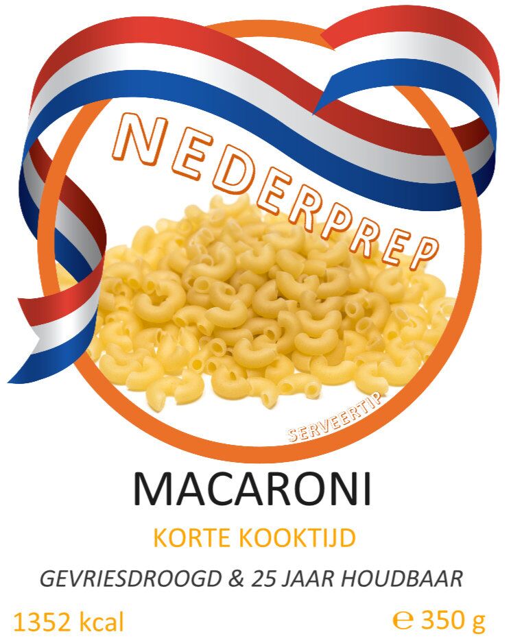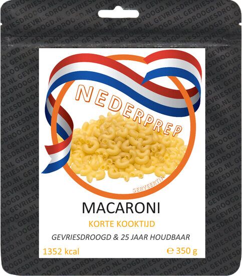 Een handige basis is de gevriesdroogde macaroni van NEDERPERP. Het is dankzij het vriesdroog proces 25 jaar houdbaar en van dit zakje met 350 g droge macaroni maak je ruim 2 kg gekookte macaroni (+-10 porties)