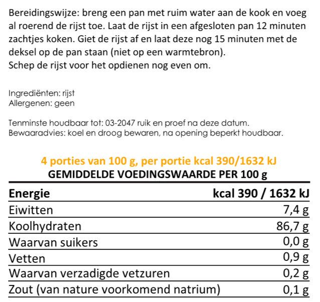 Bereidingswijze:  breng een pan met ruim water (2 liter) aan de kook en voeg al roerend de rijst toe. Laat de rijst in een afgesloten pan 12 minuten zachtjes koken. Giet de rijst af en laat deze nog 15 minuten met de deksel op de pan staan (niet op een warmtebron).
