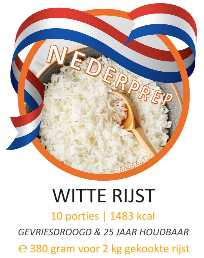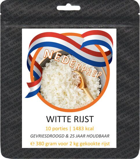 Een handige basis is de gevriesdroogde rijst van NEDERPERP. Het is dankzij het vriesdroog proces 25 jaar houdbaar en van dit zakje met 380 g droge rijst maak je +-2 kg gekookte rijst (+-10 porties)